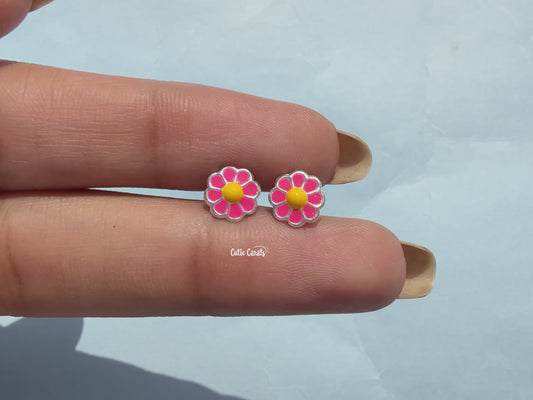 Pink Flower Daisy Enamel Baby Stud Earrings